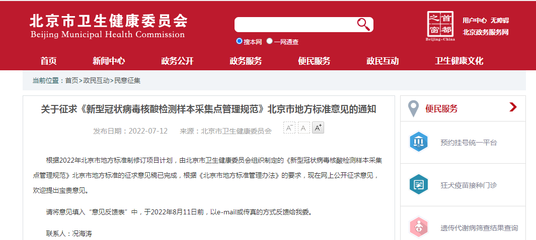 日前,據(jù)北京市市場監(jiān)督管理局網站消息,北京市衛(wèi)生健康委員會組織制定的《新型冠狀病毒核酸檢測樣本采集點管理規(guī)范》,說明了新型冠狀病毒核酸檢測樣本采集點的基本要求、采集點設置、設施設備及物品、人員要求、樣本采集、樣本保存及運輸、醫(yī)療廢棄物處理、環(huán)境消殺等多方面做出要求,指導北京的核酸采樣管理。