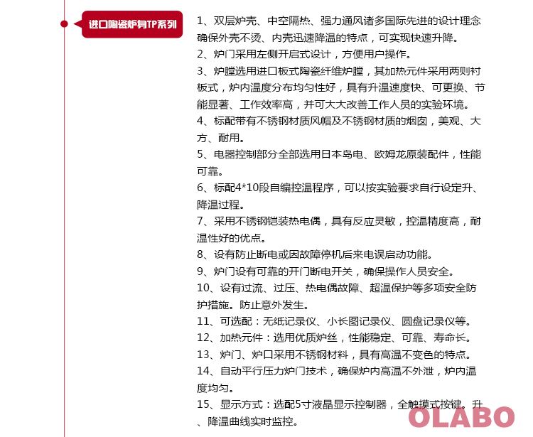 3、爐膛選用進口板式陶瓷纖維爐膛,其加熱元件采用兩則襯板式,爐內溫度分布均勻性好,具有升溫速度快、可更換、節(jié)能顯著、工作效率高,并可大大改善工作人員的實驗環(huán)境。